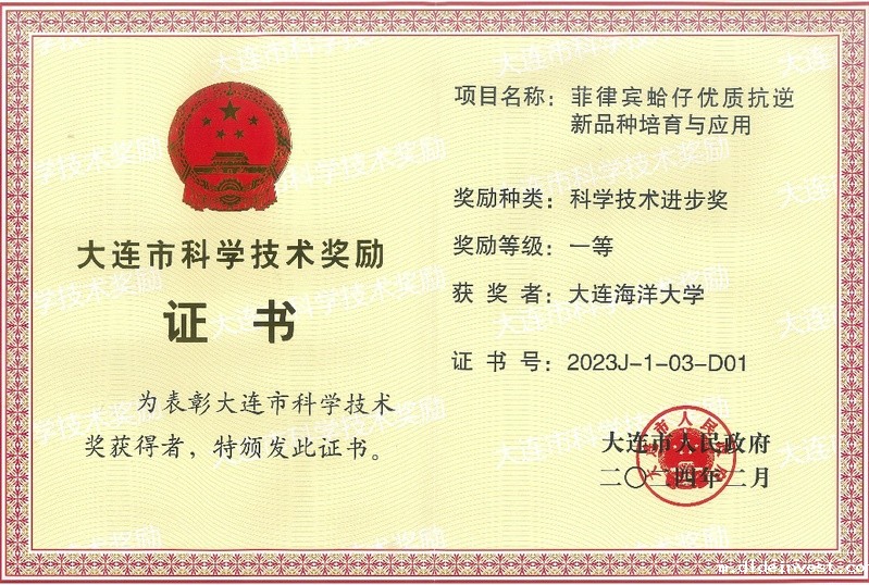2024年11月28日,2023年度大连市科学技术奖获奖名单公布,我校“滩涂贝类良种培育与增养殖科研团队”完成的“菲律宾蛤仔优质抗逆新品种培育与应用”项目获得大连市科技进步奖一等奖。 该项目针对制约我国蛤仔养殖产业发展的瓶颈问题,系统开展了蛤仔基因组学研究,种质资源评价,良种培育及苗种本地化技术研发,培育国审蛤仔新品种3个,出版专著3部,发表学术论文300余篇,其中SCI收录120余篇,制定国家/行业/地方标准5件,授权国家发明专利30余件。使我国蛤仔遗传育种研究领跑世界。 成果在辽宁、山东、福建、天津、江苏等地实施和推广,取得显著经济、社会和生态效益。 撰稿人:谭月 责任编辑:霍忠明、董君临 审核发布:刘宪杰 |